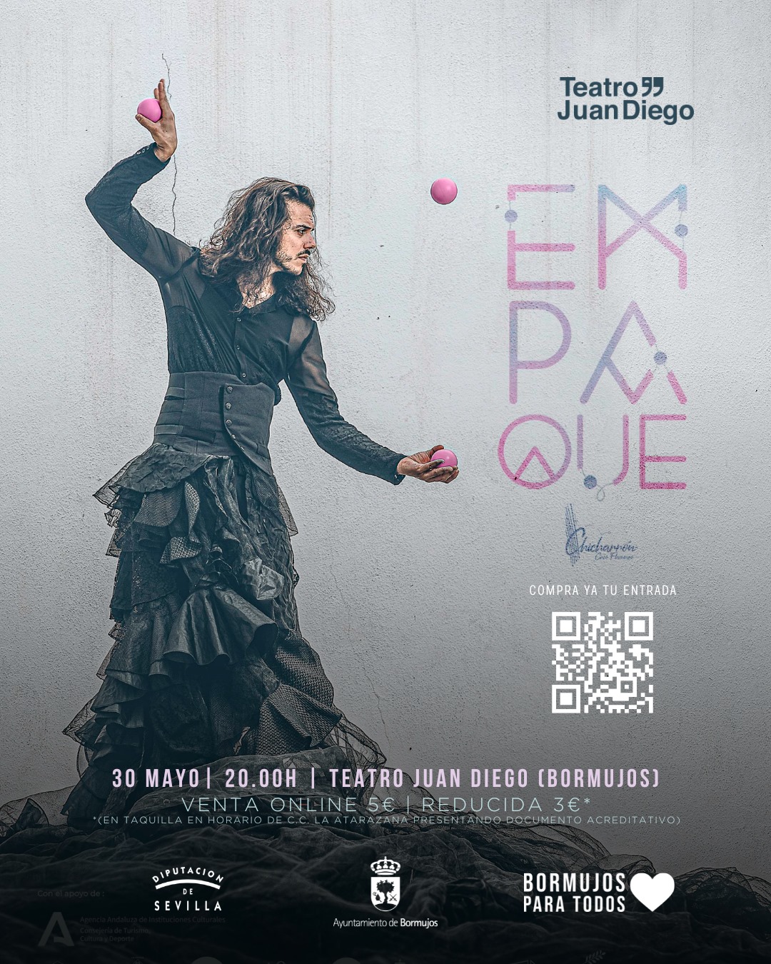 Empaque es un espectáculo del que podrás disfrutar en Bormujos en el que circo y flamenco se aúnan en un lenguaje propio para hablar sobre la identidad. Su autor, caminando entre volantes, cantes y pelotas cruzará los límites establecidos para llevarnos a su propio lar, a su esencia. Aquella en la que inseguridades y fortalezas se entrelazan a través del compás, lanzamientos, rebotes y quejíos.
