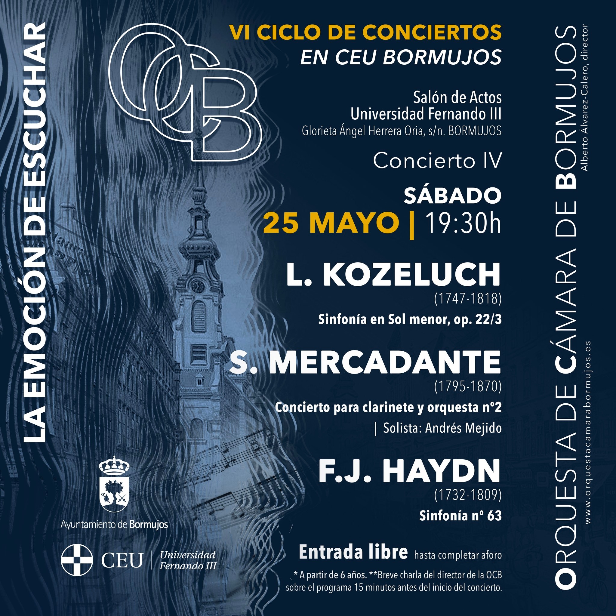 Se interpretará la sinfonía en Sol menor, op 22/3 de L. Kozeluch, un concierto para clarinete y orquesta nº2 con el solista andrés Mejido de S.Mercadante y la sinfonía nº63 de FJ Haydn.