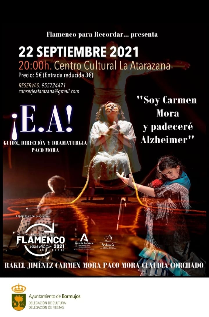 El próximo miércoles 22 de septiembre Flamenco para recordar trae a Bormujos la obra "E.A." "Soy Carmen Mora y padeceré Alzheimer", una representación que se celebra con motivo del Día Mundial del Alzheimer, que se conmemora el 21 de septiembre.