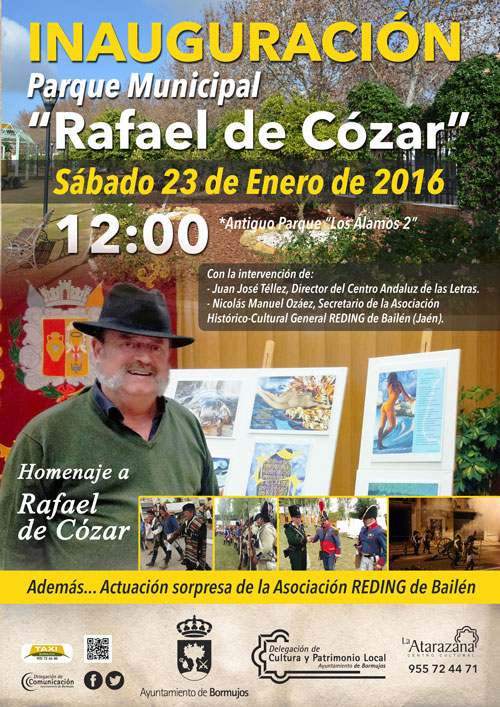 Descargar pdf Del 23 al 23 de enero de 2016 Inauguración Parque Municipal "Rafael de Cózar" Descargar pdf Información del evento Lugar: Junto a Parque Los Álamos. C/ Camino de Gines. 12:00 Inicio: 23 de enero de 2016 Finalización: 23 de enero de 2016