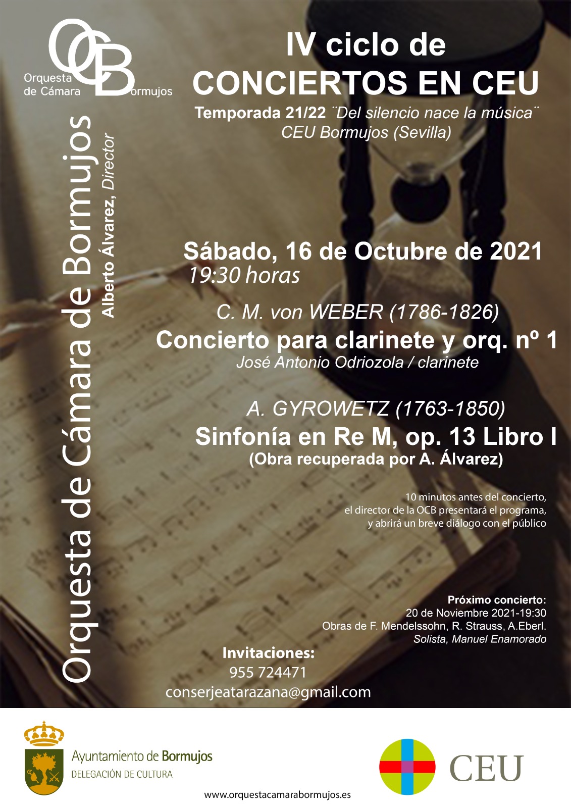 Bajo la dirección de Alberto Álvarez Calero, se podrá escuchar por primera vez una obra del compositor checo Adalbert Gyrowetz, en concreto la Sinfonía en re mayor, op. 13. En el primero de este ciclo de conciertos tendremos también el Concierto para clarinete y orquesta nº 1 de Carl Maria von Weber, con José Antonio Odriozola como solista.