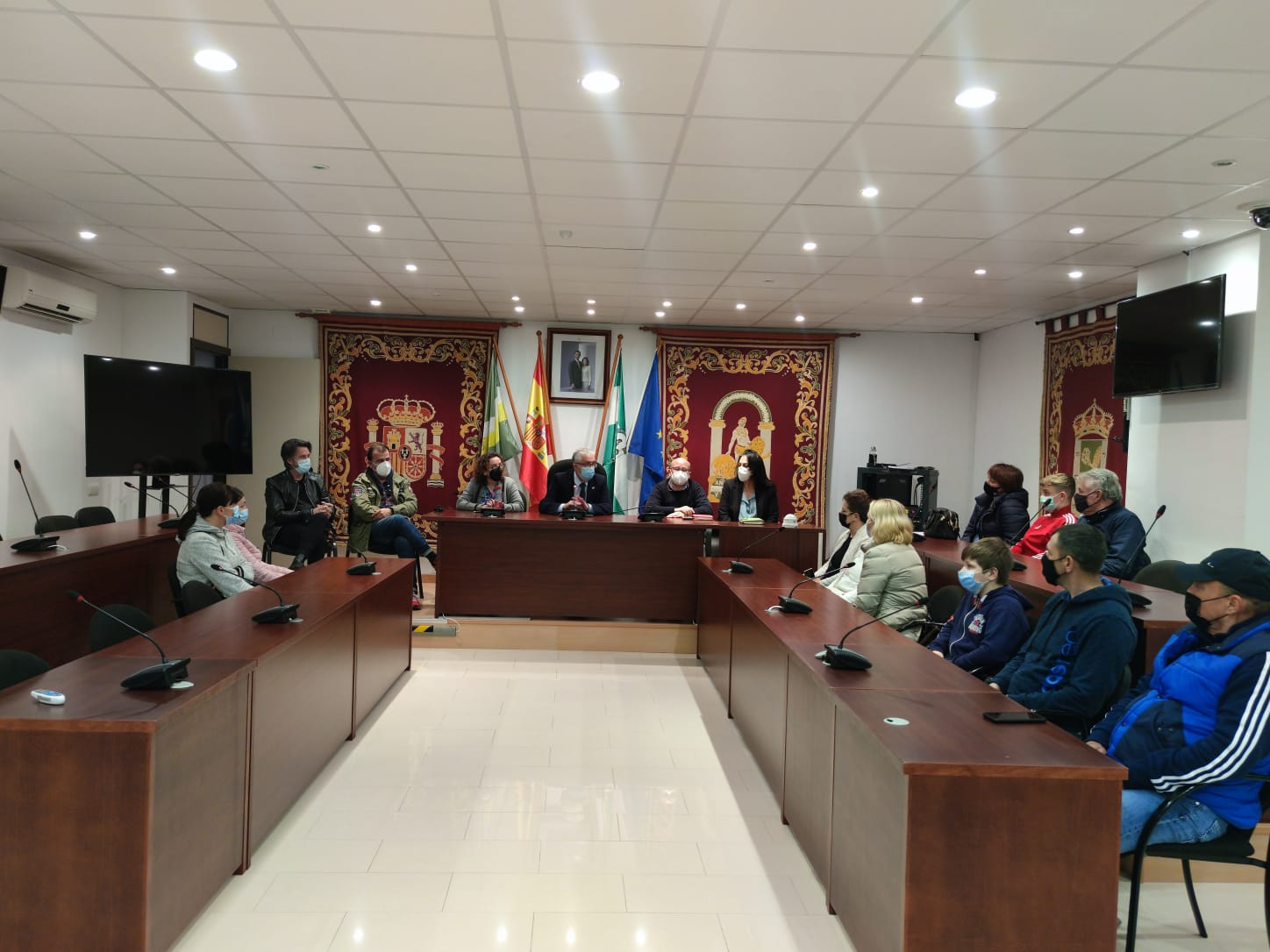 Recibidos por el alcalde, Francisco Miguel Molina Haro ; la delegada de Participación Ciudadana, Marga Beltran Exposito ; la delegada de Bienestar Social, Leonor Benítez Mata; el delegado de Cultura y Fiestas, Jesus Macarro y representantes de Policía Local y Protección Civil, los asistentes relataron con mucho dolor las noticias que les llegan de sus familiares y amigos y las demandas actuales tanto para los que se han quedado allí como para los que llegan.
