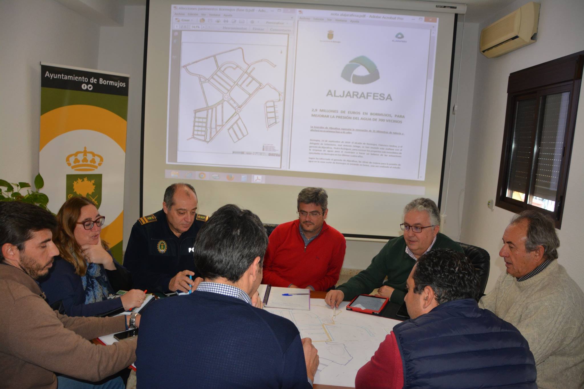 El alcalde de Bormujos, Francisco Miguel Molina Haro se ha reunido, junto al delegado de Urbanismo, Antonio Ortega Naranjo y la delegada de Obras y Servicios, Mari Carmen Garfia Medina con el Jefe de la Policía Local, los técnicos municipales de estas áreas y de la empresa Aljarafesa para conocer los últimos detalles de las obras para mejorar la presión del agua en la zona norte de Bormujos, que comienzan en la última semana de este mes de enero. En el encuentro se ha revisado la superficie en la que se actuará, así como las medidas a tomar para evitar en lo posible las molestias vecinales, ya que se trata de una intervención extensa y en la que se verán implicadas varias barriadas, para mejorar la presión del agua de más de 700 viviendas.