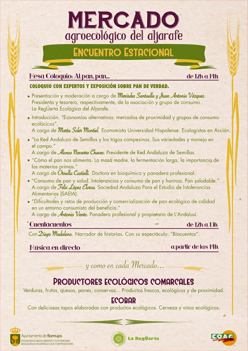 El mercado agroecológico de Aljarafe, organizado por el Ayuntamiento de Bormujos, a través de las delegaciones de Medio Ambiente y Sostenibilidad y Desarrollo Local y Emprendedores, completa su oferta. Encontrarás no sólo verduras, frutas, quesos y productos frescos, sino entretenimiento para los pequeños con un cuentacuentos y música en directo. En este encuentro estacional conoceremos también todo lo que conlleva la elaboración del pan, con expertos que hablarán sobre su composición y fabricación.