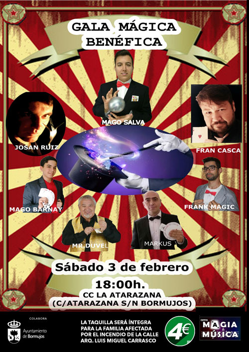 El próximo sábado 3 de febrero gran GALA MÁGICA BENÉFICA a favor de la familia de Bormujos cuya vivienda resultó afectada en un incendio. Siete magos que te enseñarán los mejores trucos y la ilusión, con el fin de que estos vecinos puedan recuperar parte de sus pérdidas. La gala, organizada por "Magia y Música" con la colaboración del Ayuntamiento de Bormujos, tendrá lugar a las 18:00 horas en el Centro Cultural La Atarazana. Colabora con 4 euros y pasa una divertida tarde, para grandes y pequeños.