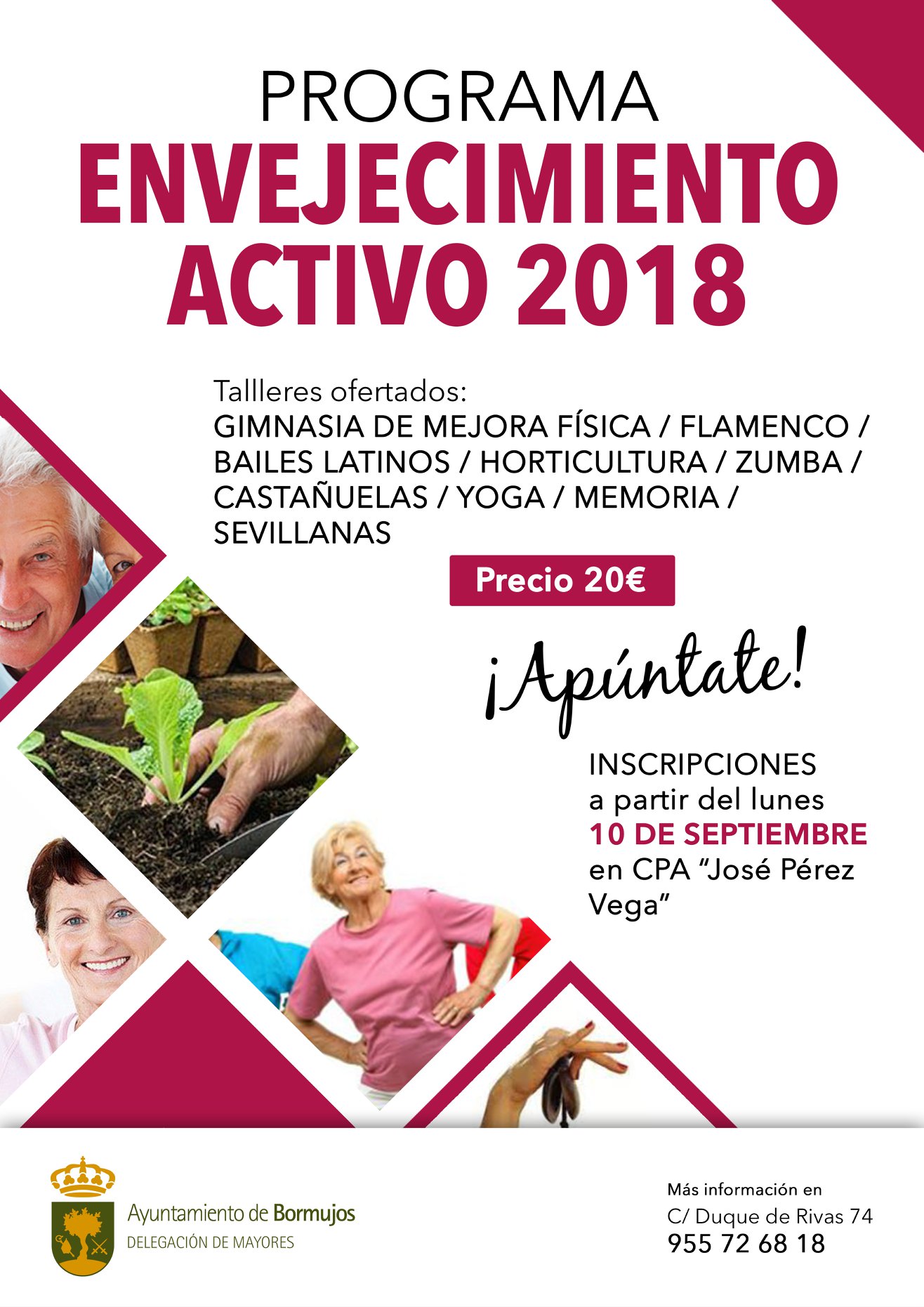 El lunes 10 de septiembre se abre el plazo para la inscripción en los talleres de envejecimiento activo para el próximo curso organizados por el Ayuntamiento de #Bormujos, a través de la Delegación de Bienestar Social y Mayores. Este año te ofrecemos: